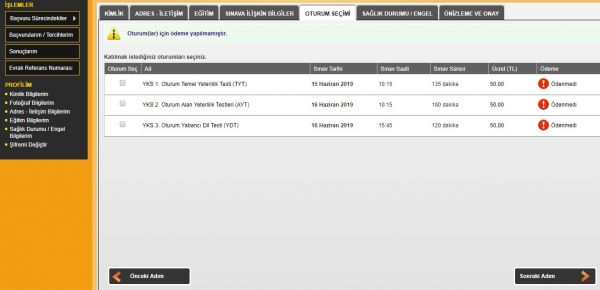 Oturum seçimi kısmında TYT kesin olarak seçilecek olup; lisans ve dil oturumları için ise AYT ve YDT seçilmelidir.