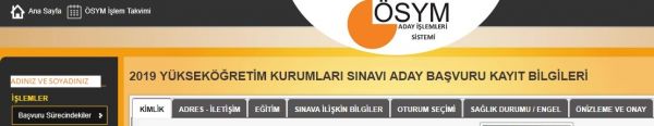 Kayıt bilgilerinizin geldiği alanda kimlik,adres-iletişim , eğitim, sınava ilişkin bilgiler , oturum seçimi,sağlık durumu/engel , önizleme ve onay kısımları karşımıza çıkmaktadır.