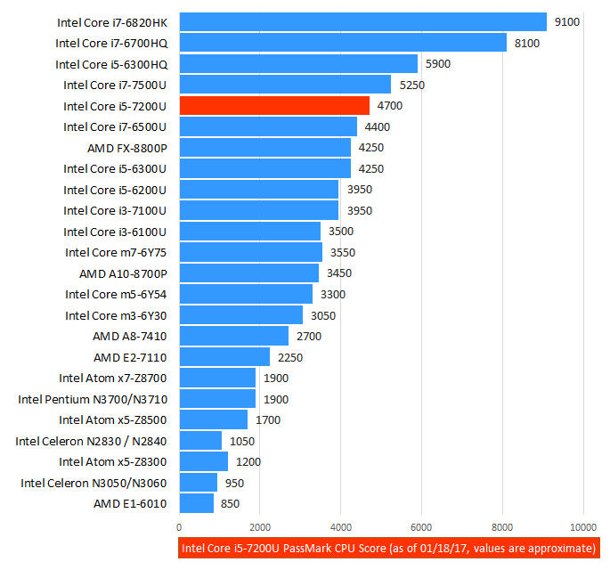 PassMark sonuçlarına göre, bir önceki neslin i7 işlemcisini geçen bir performans sergileyen i5 7200u işlemcisi HQ serisi performans işlemcilerinin ise oldukça gerisinde kalıyor. Ancak 940m, 930m gibi orta seviye ekran kartları ile çalıştığında herhangi bir veri yolu daralması söz konusu değil. Bizim incelediğimiz cihazda 940mx ekran kartıyla birlikte oldukça uyumlu çalışan 7200u işlemcisi orta seviye oyunların altından başarılı bir şekilde kalkıyor. Ancak oyun performansını dorukta yaşamak isteyenlerin mobil tarafta HQ serisi işlemcilere yönelmeli.